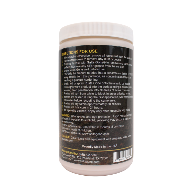 Say goodbye to the relentless battle against rust and welcome lasting peace of mind with Rusts Gone. Our industrial-grade rust converter is engineered to arrest and transform existing rust, offering a comprehensive and enduring solution to rust-related problems.